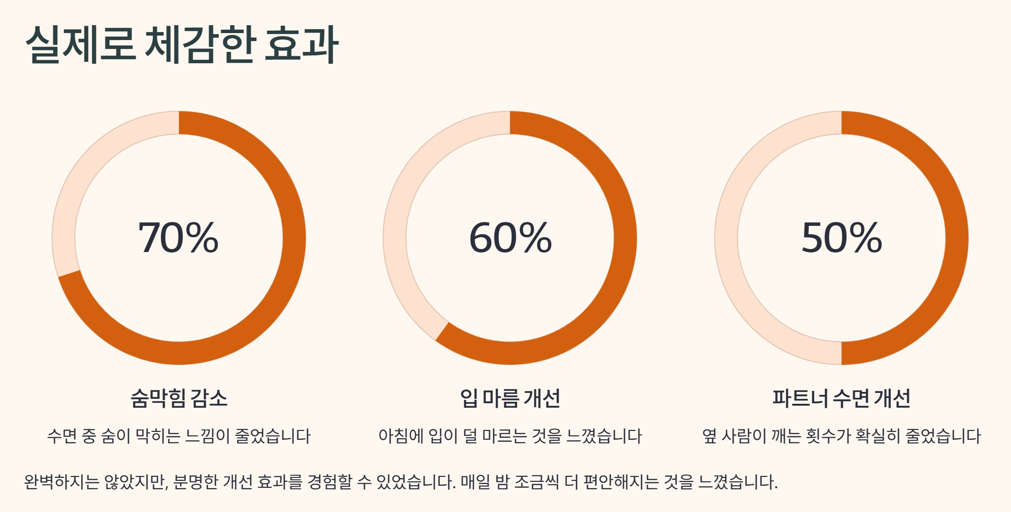 코골이 방지기구를 사용한 뒤 가장 먼저 느낀 변화는 수면 중 숨이 막히는 느낌이 줄었다는 점이다. 아침에 입이 덜 마르고, 옆 사람이 깨는 횟수도 확실히 줄었다. 완벽하지는 않았지만 분명한 개선은 있었다, 경험했다.