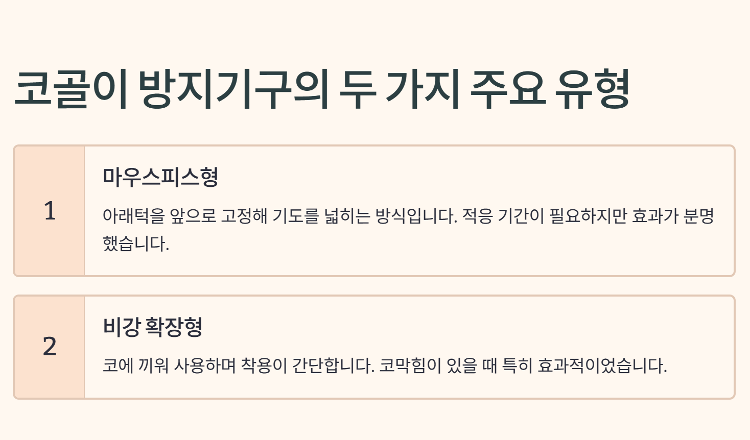코막힘이 주원인인지, 혀나 턱 위치 문제인지에 따라 맞는 코골이 방지기구가 다르다. 무조건 비싼 제품보다는 자신의 원인에 맞는 유형을 고르는 게 훨씬 중요했다, 배웠다.