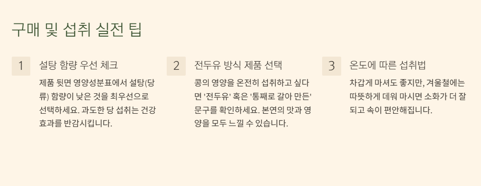 - 콩의 영양을 온전히 섭취하고 싶다면 '전두유' 혹은 '통째로 갈아 만든' 문구를 확인하세요.