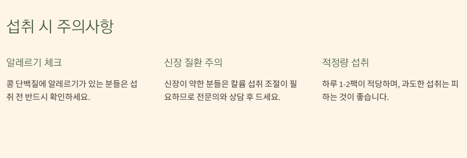 너무 달콤한 제품은 맛은 좋지만 과도한 당 섭취로 이어질 수 있으니 가급적 무첨가나 저당 제품을 고르시는 게 좋습니다. 또한, 콩을 통째로 갈아 넣은 '전두유' 방식의 제품이 영양소 파괴가 적고 본연의 맛을 느끼기에 좋습니다. 다만, 콩 단백질에 알레르기가 있거나 신장이 약한 분들은 칼륨 섭취를 조절해야 하므로 전문의와 상의 후 적당량을 드시는 것이 안전합니다.