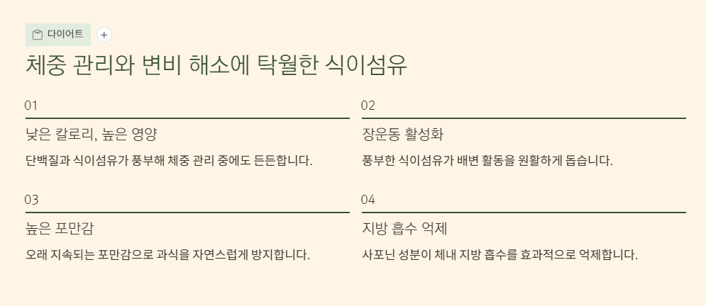 - 장 건강 및 다이어트: 풍부한 식이섬유가 변비를 개선하고 높은 포만감을 줍니다.