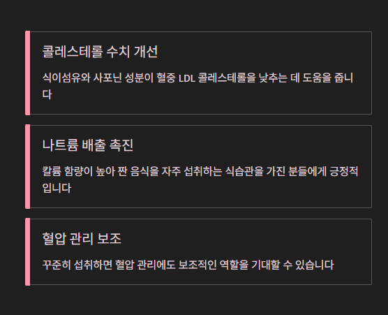 또한 칼륨 함량이 높아 나트륨 배출을 돕기 때문에, 짠 음식을 자주 섭취하는 식습관을 가진 분들에게도 긍정적인 영향을 줄 수 있습니다. 꾸준히 섭취하면 혈압 관리에도 보조적인 역할을 기대할 수 있습니다.