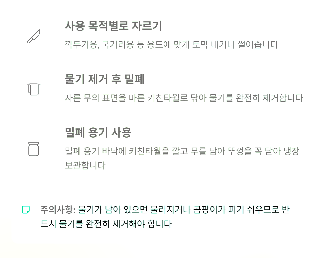 - 물기 제거 후 밀폐: 자른 무의 표면에 물기가 있다면 반드시 마른 키친타월로 닦아내야 합니다. 물기가 남아 있으면 물러지거나 곰팡이가 피기 쉽습니다.