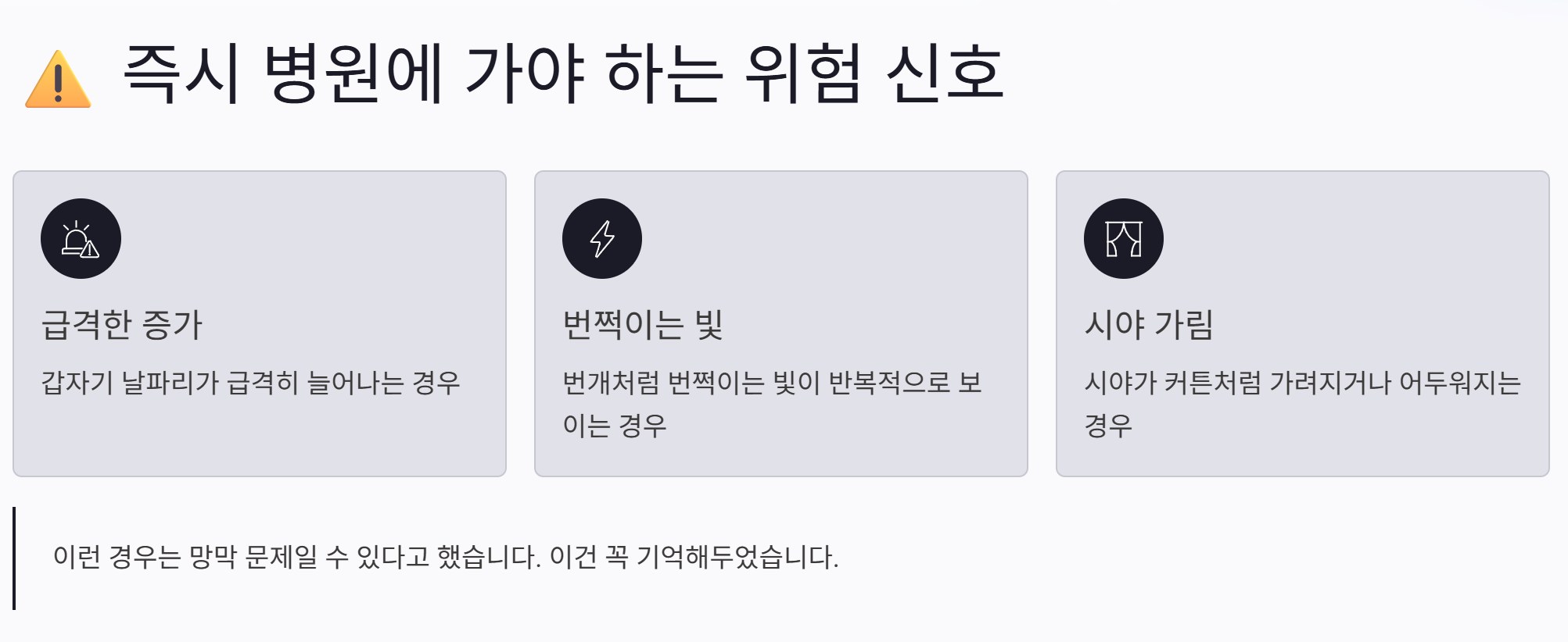 갑자기 날파리가 급격히 늘어나거나, 번개처럼 번쩍이는 빛이 보이거나, 시야가 커튼처럼 가려질 때는 바로 병원을 가야 한다고 들었습니다. 이런 경우는 망막 문제일 수 있다고 했습니다, 이건 꼭 기억해두었습니다.