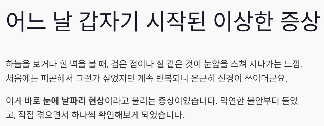 저처럼 이런 경험을 한 분들이 많을 텐데, 이게 바로 눈에 날파리 현상이라고 불리는 증상이었습니다. 막연한 불안부터 들었고, 직접 겪으면서 하나씩 확인해보게 되었습니다, 해보니 알겠더군요, 그렇게 지나왔습니다.