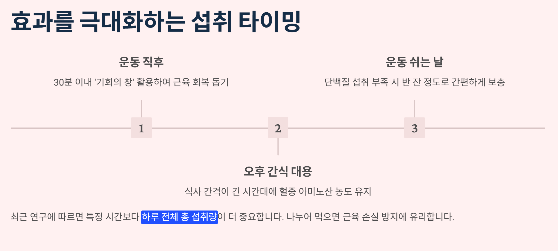 많은 분이 운동 직후 30분을 '기회의 창'이라고 부르며 서둘러 마시곤 합니다. 틀린 말은 아니지만, 최근 연구들에 따르면 하루 전체의 총 섭취량이 더 중요하다고 해요.