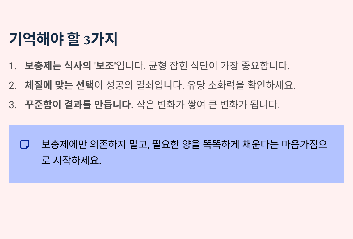 💡 보충제 섭취 실전 요약 및 꿀팁