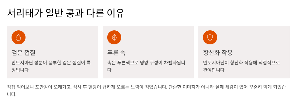 서리태는 껍질이 검고 속은 푸른 콩으로, 흔히 ‘검은콩’이라 불리지만 영양 구성에서 차이가 느껴졌습니다. 특히 껍질에 포함된 안토시아닌 성분이 강점인데, 이 성분은 항산화 작용에 직접적으로 관여하는 것으로 알려져 있습니다.