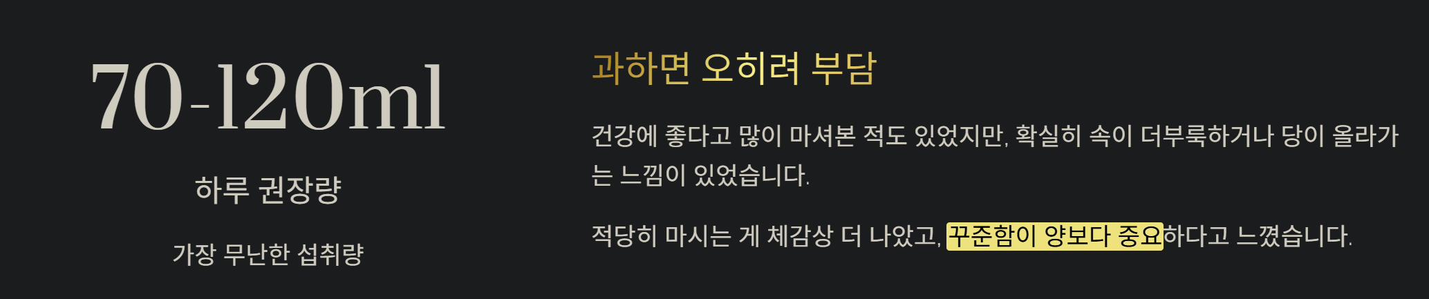 - 하루 70~120ml 사이가 가장 무난하고 꾸준히 마시는 게 핵심이었다죠.