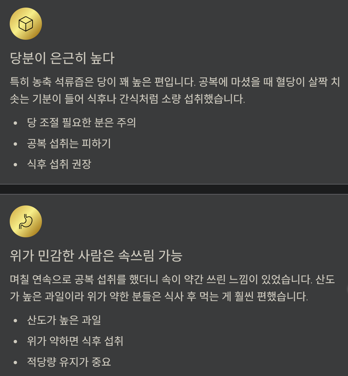 - 당도가 높고 산도가 있어 위가 민감하면 식후 섭취가 편했다.