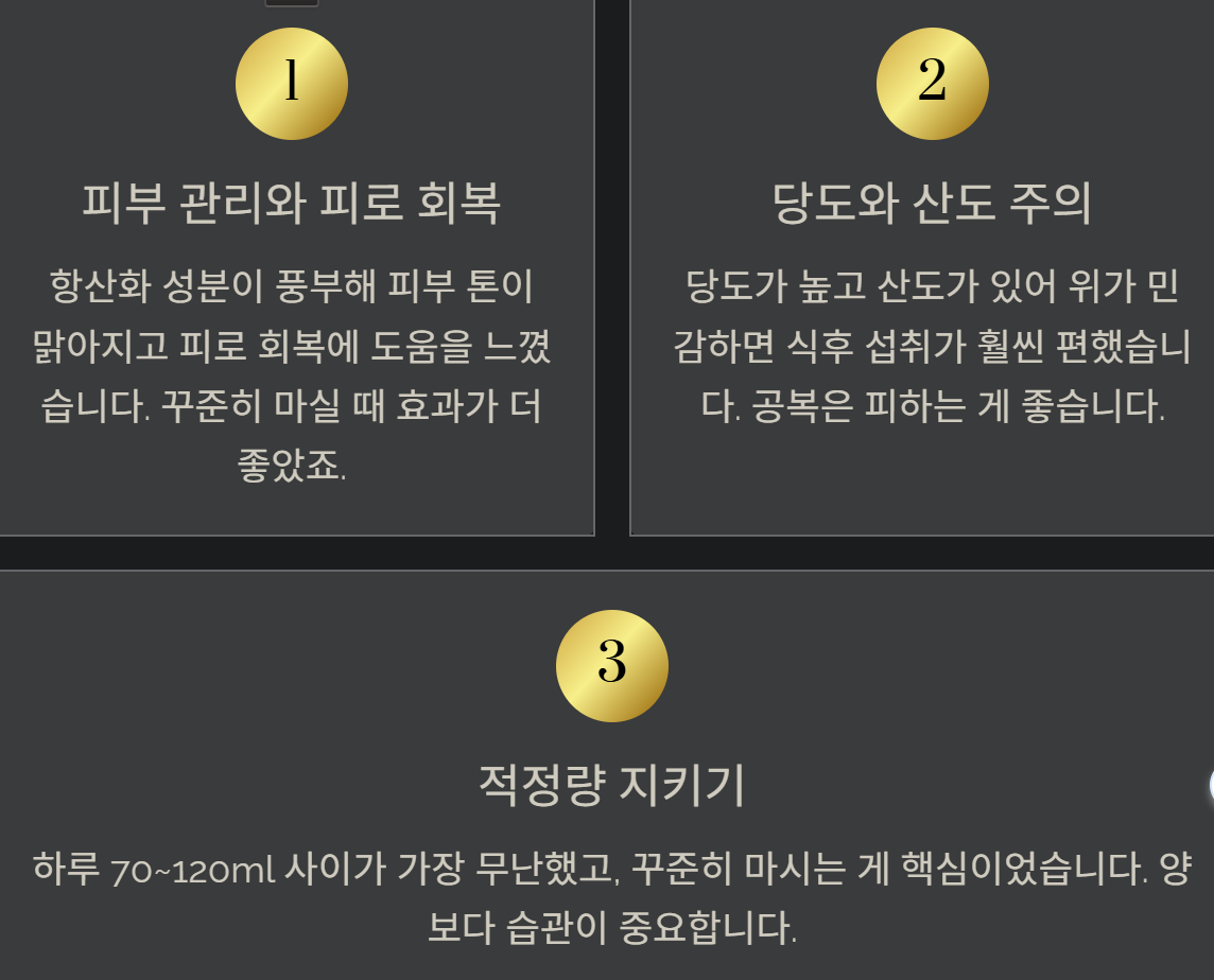 폴리페놀 덕분에 피로감이 누적될 때 몸이 조금 가벼워지는 느낌이 들었고, 운동 후 회복도 예전보다 빠른 편이었죠. 이런 부분은 꾸준히 마셔본 사람만 체감할 수 있는 차이라 생각했습니다.
