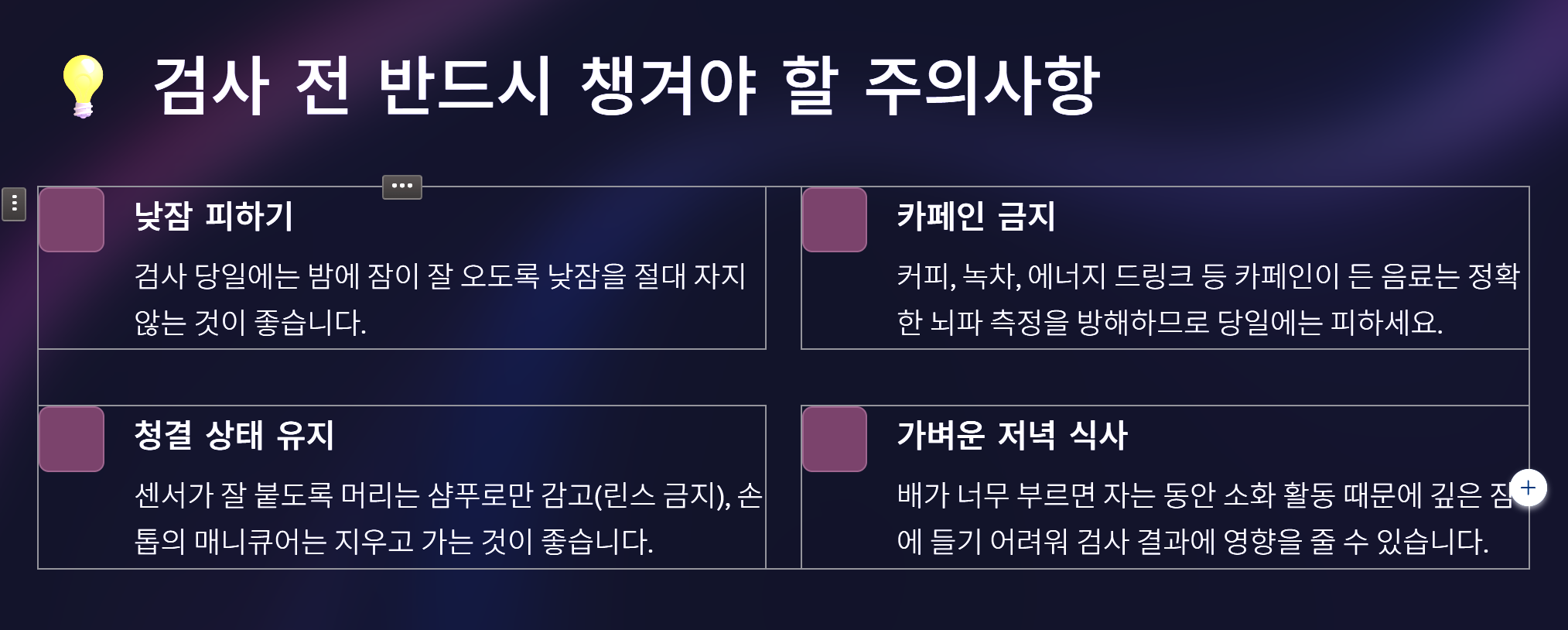 - 카페인 금지: 커피, 녹차, 에너지 드링크 등 카페인이 든 음료는 정확한 뇌파 측정을 방해하므로 당일에는 피하세요.