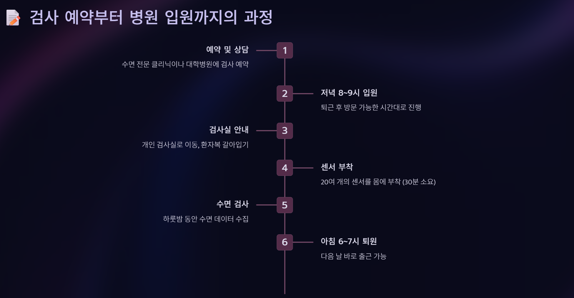실전 팁: 검사 당일 저녁 식사는 평소보다 조금 가볍게 하세요. 배가 너무 부르면 자는 동안 소화 활동 때문에 깊은 잠에 들기 어려워 검사 결과에 영향을 줄 수 있습니다.