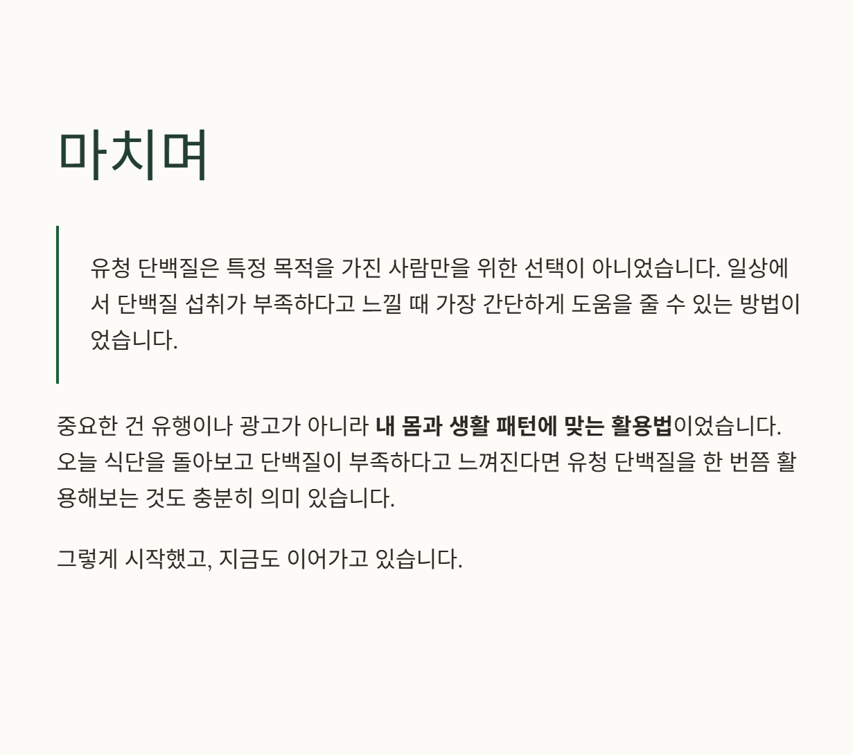 유청 단백질은 특정 목적을 가진 사람만을 위한 선택이 아니었다. 일상에서 단백질 섭취가 부족하다고 느낄 때 가장 간단하게 도움을 줄 수 있는 방법이었다. 중요한 건 유행이나 광고가 아니라 내 몸과 생활 패턴에 맞는 활용법이었다.