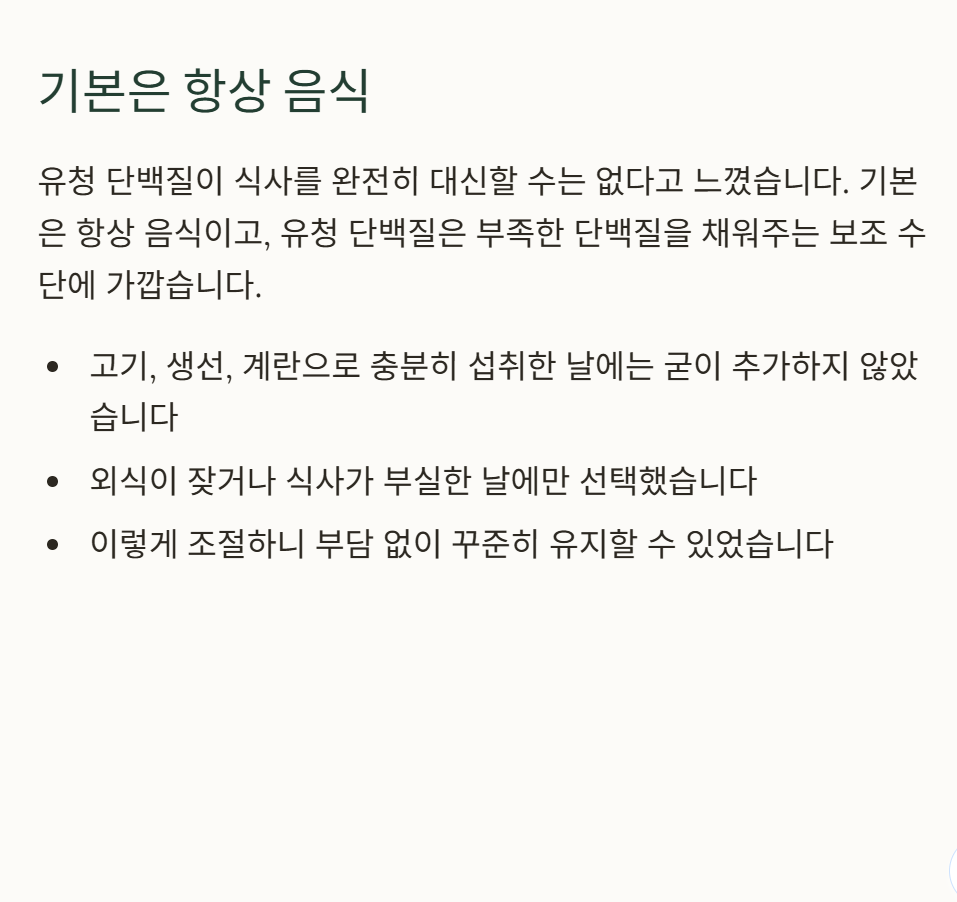 고기, 생선, 계란으로 단백질을 충분히 섭취한 날에는 굳이 추가하지 않았다. 반대로 외식이 잦거나 식사가 부실한 날에만 선택했다. 이렇게 조절하니 부담 없이 꾸준히 유지할 수 있었다, 경험상 가장 현실적이었다.