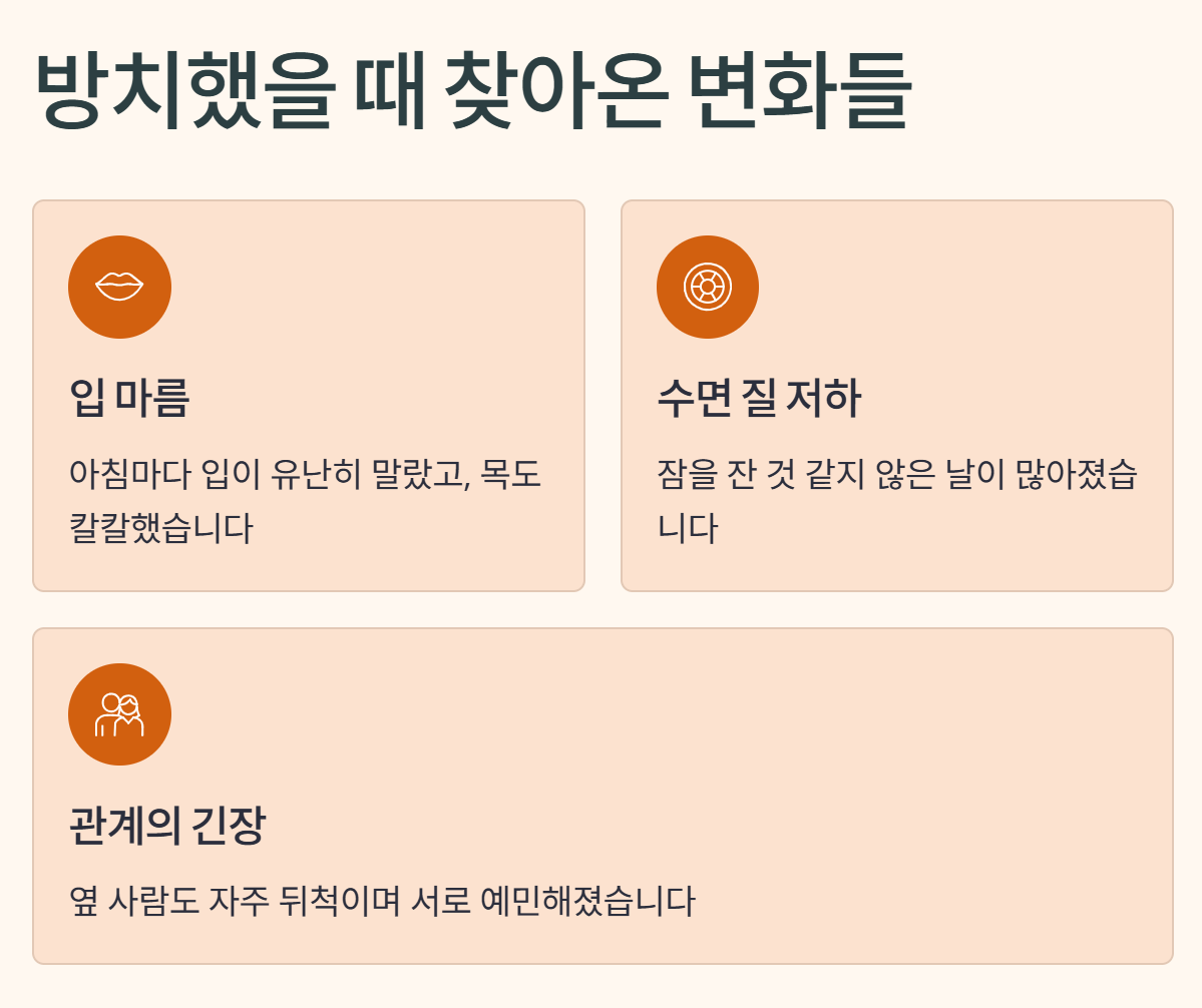 코골이는 단순히 소리 문제만은 아니었다. 아침에 일어나면 입이 유난히 마르고, 잠을 잔 것 같지 않은 날이 많아졌다. 옆에서 자는 사람도 자주 뒤척이게 되면서 서로 예민해지는 순간이 늘어났다. 이 상태를 계속 두는 건 좋지 않겠다는 생각이 들었다, 느꼈다.