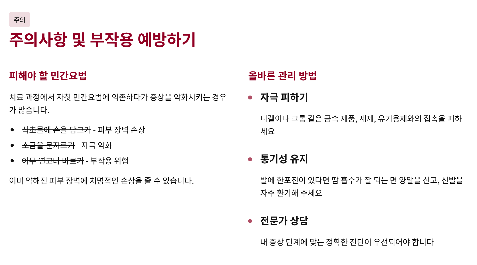 치료 과정에서 자칫 민간요법에 의존하다가 증상을 악화시키는 경우를 많이 봤습니다. 식초물에 손을 담그거나 소금을 문지르는 등의 행위는 이미 약해진 피부 장벽에 치명적인 손상을 줄 수 있어요. 또한, 가렵다고 아무 연고나 막 바르기보다는 내 증상 단계에 맞는 정확한 진단이 우선되어야 합니다.