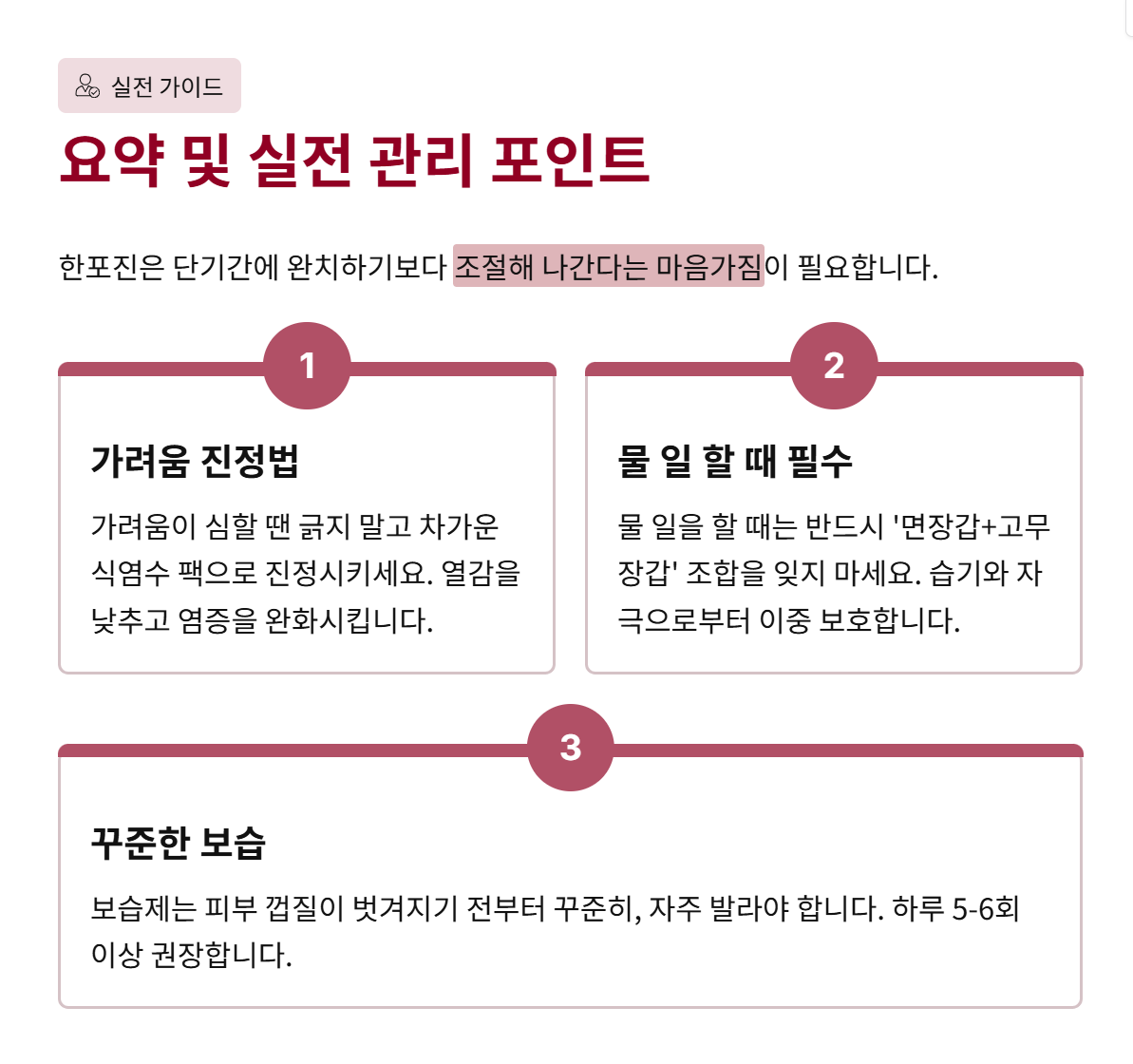 제가 겪어보니 한포진은 우리 몸이 보내는 '휴식의 신호' 같기도 하더라고요. 면역력이 떨어질 때마다 귀신같이 올라오는 걸 보면서, 단순히 겉만 치료할 게 아니라 내 몸의 전체적인 컨디션을 돌보는 것이 치료의 시작이라는 점을 깨달았습니다.