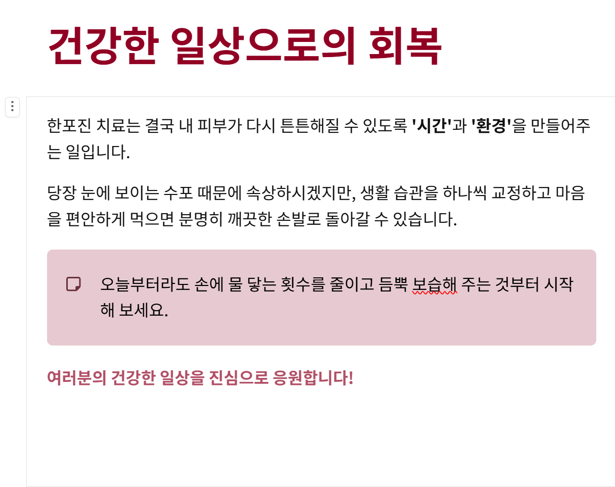 한포진 치료는 결국 내 피부가 다시 튼튼해질 수 있도록 '시간'과 '환경'을 만들어주는 일입니다. 당장 눈에 보이는 수포 때문에 속상하시겠지만, 생활 습관을 하나씩 교정하고 마음을 편안하게 먹으면 분명히 깨끗한 손발로 돌아갈 수 있어요.