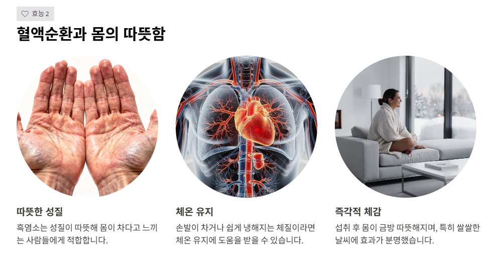 흑염소는 성질이 따뜻한 편으로 분류되어, 몸이 차다고 느끼는 사람들에게 많이 권해집니다. 손발이 차거나, 쉽게 몸이 냉해지는 체질이라면 체온 유지에 도움을 받을 수 있습니다.