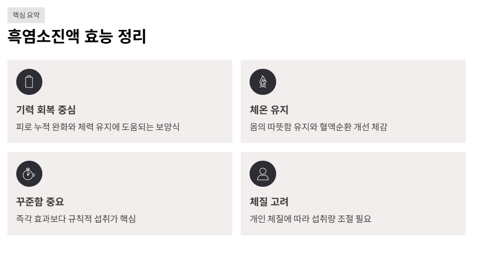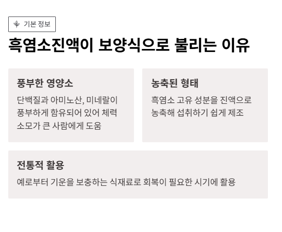 진액 형태는 흑염소 고유의 성분을 농축해 섭취하기 쉽게 만든 형태라, 고기를 직접 먹기 부담스러운 사람에게도 접근성이 좋았습니다. 실제로 꾸준히 섭취했을 때 몸이 덜 처지는 느낌을 받았습니다.