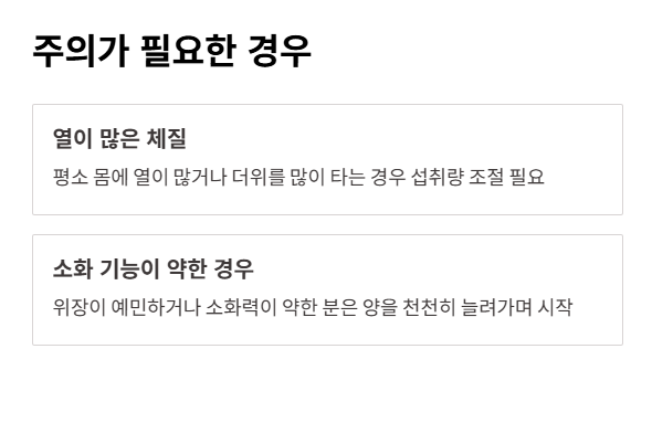 반대로 평소 열이 많은 체질이거나, 소화 기능이 약한 경우에는 섭취량을 조절하는 것이 필요하다고 느꼈습니다.