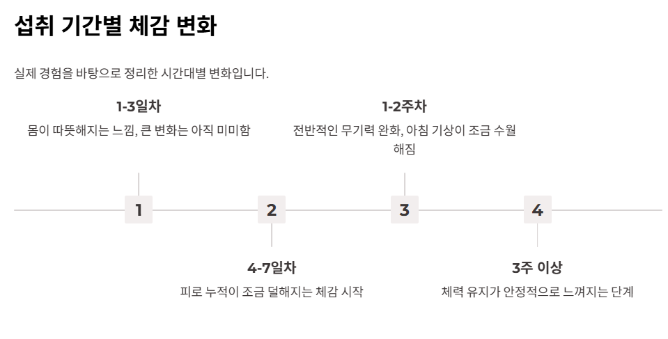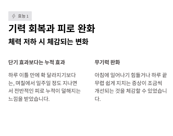 직접 먹어보니 단기간에 확 달라진다기보다는, 며칠에서 일주일 정도 지나면서 전반적인 피로 누적이 덜해지는 느낌이 들었습니다. 무기력한 상태가 조금 완화되는 체감이 있었습니다.