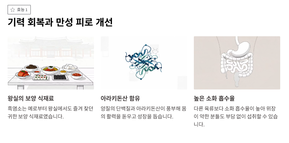 - 기력 증진: 고단백, 저지방 식품으로 소화가 잘되며 만성 피로 회복을 돕습니다.